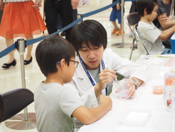 グランフロント大阪や神戸大丸など各所で開催をして、大人気の科学部による「人工イクラ」「スライム」作り。