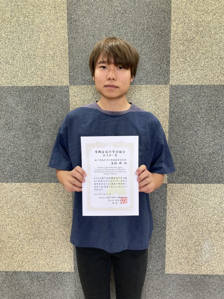 大学院 薬学研究科の稲垣冬彦教授研究室(有機反応化学研究室)に所属するD2 髙橋暉さんが、2025年9月17日~19日に岡山大学津島キャンパスで開催されました第71回有機金属化学討論会にて、「ポスター賞」を受賞しました。