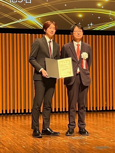 最優秀演題賞の表彰を受けた飯田翔輝さん(左)