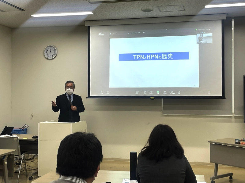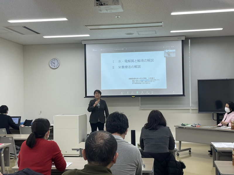 開会にあたり、「Home Infusion研究会」代表を務める薬学部の辻本貴江准教授があいさつしました。第1部は、滋慶医療科学大学大学院の大石雅子教授が電解質輸液と栄養輸液について詳しく解説、株式会社コメディクスの宇野達也氏は、医療用麻薬による在宅患者の疼痛管理や医療用麻薬注射剤のポンプについて解説しました。続いて、千里金蘭大学栄養学部の井上義文教授(NST医師)の特別講演「在宅静脈栄養―長期間、安全に実施するためには―」があり、在宅静脈栄養の現状と課題について学びました。