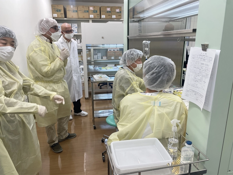 「第5回 Home Infusion 研究 ~無菌調製講習会~」が2月1日、ポートアイランドキャンパスで、オンラインも併用して開催されました。テーマは「Home to Hospital to Home : 地域で支える、患者さん中心の在宅輸液療法」で、在宅医療におけるホームインフュージョン(注1)の普及と、担い手となる調剤薬局薬剤師の支援が開催目的です。第1部は、在宅静脈栄養療(HPN)についての講義、第2部は、実際にクリーンベンチ(注2)を用いて無菌調製の技術指導が実施されました。第1部はオンラインも含めて全国から約70人が参加、第2部は16人の薬剤師が現地参加し、盛況でした。